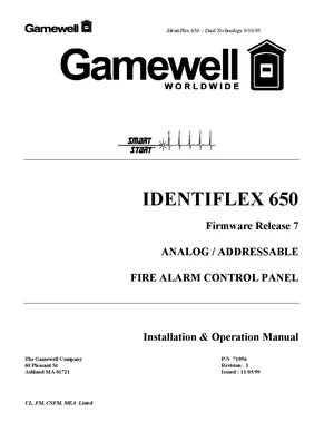 Installation, Operations, and Programming Manual for the Gamewell FCI IDENTIFLEX 650, published in 2001. Document No: 71956, Rev: 1. 36 models including IDENTIFLEX 650, IF650, IF654 and 33 additional variants. Mounting and wiring instructions, user operating guides, and system software setup.
