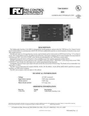 Datasheet for the Gamewell FCI IDU, published in 1998. Document No: 9020-0462, Rev: 1.2. 13 models including IDU, 7200 Series, FC-ID Series and 10 additional variants. Product features, environmental operating limits, and compatibility data.