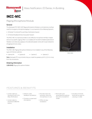 Datasheet for the Gamewell FCI INCC-MIC, published in 2017. Document No: 9021-60402, Rev: D. Models INCC-MIC and 1100-0452. Product features, environmental operating limits, and compatibility data.