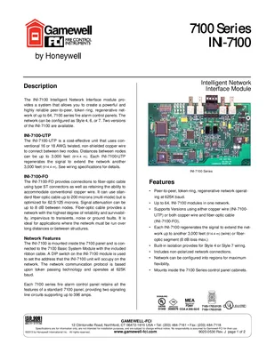 Datasheet for the Gamewell FCI INI-7100, published in 2013. Document No: 9020-0530, Rev: J. Models INI-7100, INI-7100-UTP and INI-7100-FO. Engineering specifications, wiring diagrams, and mounting dimensions.