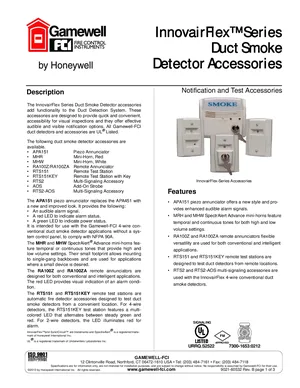 Datasheet for the Gamewell FCI InnovairFlex Series Duct Accessories, published in 2013. Document No: 9021-60532, Rev: B. 14 models including APA151, MHR, MHW and 11 additional variants. Product features, environmental operating limits, and compatibility data.
