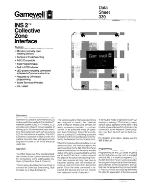 Datasheet for the Gamewell FCI INS 2 Collective Zone Interface, published in 1998. Document No: 339. 23 models including INS 2, CZI, 30771-10 and 20 additional variants. Product features, environmental operating limits, and compatibility data.