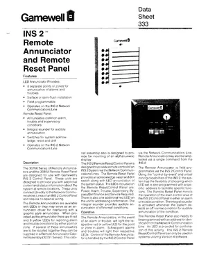 Datasheet for the Gamewell FCI INS 2 Remote Annunciators, published in 1993. Document No: 333, Rev: 11/93. Models 30766, 30766-01 and 30852. Engineering specifications, wiring diagrams, and mounting dimensions.