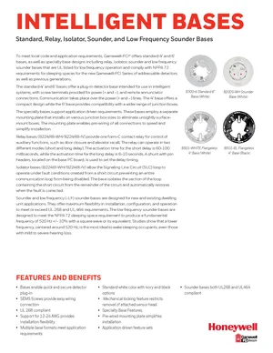 Datasheet for the Gamewell FCI Intelligent Bases, published in 2019. Document No: 9021-60540, Rev: K. 30 models including B210LP, B210LPA, B210LPBP and 27 additional variants. Product features, environmental operating limits, and compatibility data.
