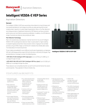 Datasheet for the Gamewell FCI Intelligent VESDA-E VEP Series, published in 2018. Document No: 9021-61030, Rev: A. Models VEP-A00-1P-GW, VEP-A00-P-GW and VEP-A10-P-GW. Product features, environmental operating limits, and compatibility data.