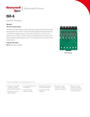 Datasheet for the Gamewell FCI ISO-6, published in 2017. Document No: 9021-60896, Rev: B. 4 models including ISO-6, BB-2, BB-6 and 1 additional variants. Detailed technical specifications, electrical ratings, and agency listings.