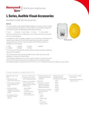 Datasheet for the Gamewell FCI L Series Audible Visual Accessories, published in 2018. Document No: 9021-60934, Rev: C. Model MP120KL. Engineering specifications, wiring diagrams, and mounting dimensions.