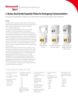 Datasheet for the Gamewell FCI L-Series Dual Strobe Expander Plates, published in 2018. Document No: 9021-61017, Rev: A. 16 models including SEP-SPSWL, SEP-SPSWL-P, SPSEP-BBSWL and 13 additional variants. Engineering specifications, wiring diagrams, and mounting dimensions.