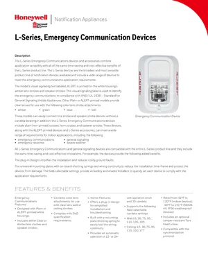 Datasheet for the Gamewell FCI L-Series Emergency Communication Devices, published in 2018. Document No: 9021-60933, Rev: C. 10 models including SWL-CLR-ALERT, SWL-ALERT, SCWL-CLR-ALERT and 7 additional variants. Detailed technical specifications, electrical ratings, and agency listings.