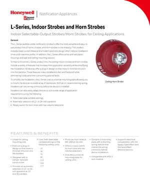 Datasheet for the Gamewell FCI L-Series Indoor Strobes and Horn Strobes, published in 2018. Document No: 9021-60928, Rev: C. 12 models including PC2RL, PC2WL, PC4RL and 9 additional variants. Detailed technical specifications, electrical ratings, and agency listings.
