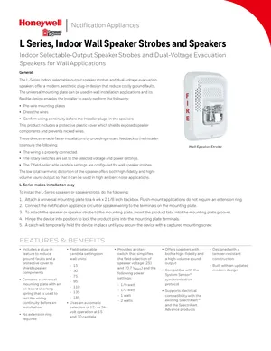 Datasheet for the Gamewell FCI L-Series Indoor Wall Speaker Strobes, published in 2018. Document No: 9021-60931, Rev: C. 16 models including SPWL, SPRL, SPSWL and 13 additional variants. Detailed technical specifications, electrical ratings, and agency listings.