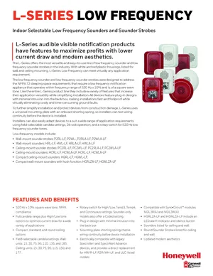 Datasheet for the Gamewell FCI L-Series Low Frequency, published in 2020. Document No: 9021-62013, Rev: C. 30 models including P2RL-LF, P2RLA-LF, P2WL-LF and 27 additional variants. Detailed technical specifications, electrical ratings, and agency listings.