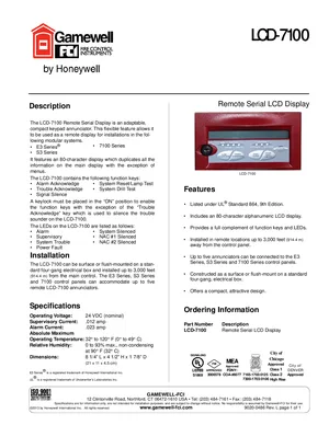 Datasheet for the Gamewell FCI LCD-7100, published in 2013. Document No: 9020-0486, Rev: L. Model LCD-7100. Detailed technical specifications, electrical ratings, and agency listings.