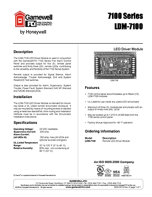 Datasheet for the Gamewell FCI LDM-7100, published in 2009. Document No: 9020-0519, Rev: E. Model LDM-7100. Product features, environmental operating limits, and compatibility data.