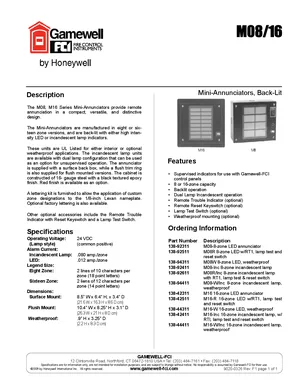Datasheet for the Gamewell FCI M08/16 Mini-Annunciators, published in 2009. Document No: 9020-0326, Rev: F1. 22 models including M08, M16, 138-92311 and 19 additional variants. Product features, environmental operating limits, and compatibility data.