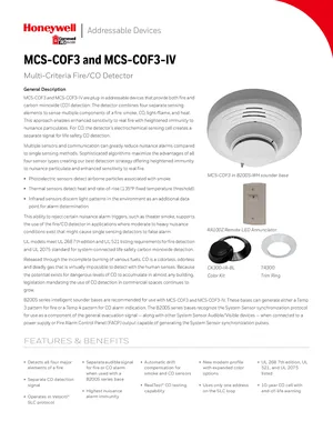 Datasheet for the Gamewell FCI MCS-COF3 and MCS-COF3-IV, published in 2019. Document No: 9021-61099, Rev: A. 26 models including MCS-COF3, MCS-COF3-IV, B501-WHITE and 23 additional variants. Engineering specifications, wiring diagrams, and mounting dimensions.