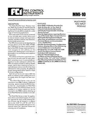 Datasheet for the Gamewell FCI MMI-10, published in 2002. Document No: 9020-0538, Rev: 1.0. 5 models including MMI-10, MBB-2, MBB-6 and 2 additional variants. Detailed technical specifications, electrical ratings, and agency listings.