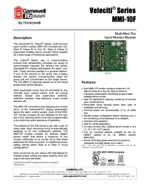 Datasheet for the Gamewell FCI MMI-10F, published in 2008. Document No: 9020-0631, Rev: B1. 4 models including MMI-10F, MBB-2, MBB-6 and 1 additional variants. Product features, environmental operating limits, and compatibility data.