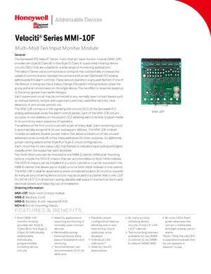 Datasheet for the Gamewell FCI MMI-10F, published in 2017. Document No: 9020-0631, Rev: D. 5 models including MMI-10F, MBB-2, MBB-6 and 2 additional variants. Product features, environmental operating limits, and compatibility data.