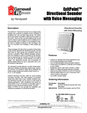 Datasheet for the Gamewell FCI PF24V, published in 2008. Document No: 9021-60255, Rev: A. Models PF24V and BBS-SP201W. Detailed technical specifications, electrical ratings, and agency listings.