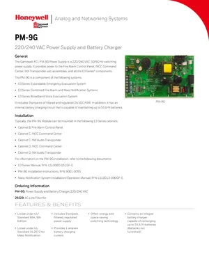 Datasheet for the Gamewell FCI PM-9G, published in 2017. Document No: 9021-60391, Rev: J. Models PM-9G and 29229. Product features, environmental operating limits, and compatibility data.