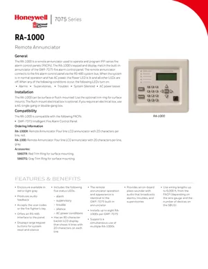 Datasheet for the Gamewell FCI RA-1000, published in 2017. Document No: 9021-601007, Rev: A. 5 models including RA-1000, RA-1000R, GWF-7075 and 2 additional variants. Engineering specifications, wiring diagrams, and mounting dimensions.