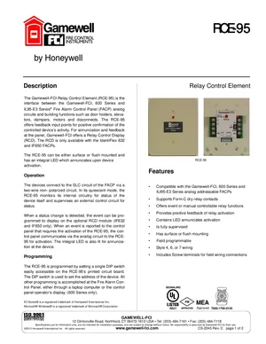 Datasheet for the Gamewell FCI RCE-95, published in 2013. Document No: CS-2045, Rev: C. 5 models including RCE-95, 70839, RCD and 2 additional variants. Engineering specifications, wiring diagrams, and mounting dimensions.