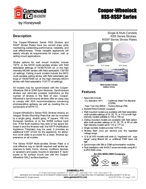 Datasheet for the Gamewell FCI RSS and RSSP Series Strobes, published in 2008. Document No: 9020-0575, Rev: B1. 12 models including RSS-24MCW-FR, RSS-241575W-FR, RSS-121575W-FR and 9 additional variants. Engineering specifications, wiring diagrams, and mounting dimensions.
