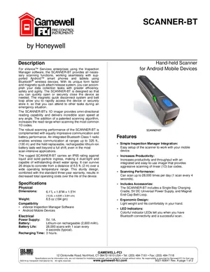 Datasheet for the Gamewell FCI SCANNER-BT, published in 2014. Document No: 9021-60841, Rev: A. Models SCANNER-BT and BARCODE-1000. Engineering specifications, wiring diagrams, and mounting dimensions.