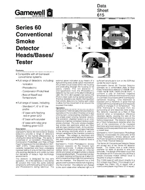 Datasheet for the Gamewell FCI 60 Series Conventional Detectors, published in 1999. Document No: 615. 13 models including 71033, 71034, 71443 and 10 additional variants. Product features, environmental operating limits, and compatibility data.