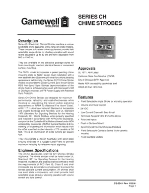 Datasheet for the Gamewell FCI Series CH Chime Strobes, published in 2002. Document No: CS-2245, Rev: 1102-6. 8 models including CH70-24MCW-FR, CH70-24MCW-FW, CH70-241575W-FR and 5 additional variants. Product features, environmental operating limits, and compatibility data.