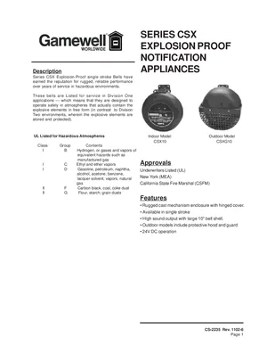 Datasheet for the Gamewell FCI CSX Series Explosion Proof Bells, published in 2002. Document No: CS-2235, Rev: 1102-6. Models CSX10 and CSXG10. Product features, environmental operating limits, and compatibility data.