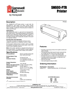 Datasheet for the Gamewell FCI SN600-PTR, published in 2009. Document No: CS-2502, Rev: A. Model SN600-PTR. Product features, environmental operating limits, and compatibility data.