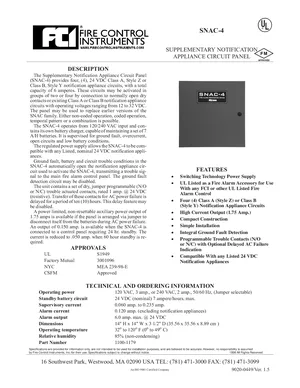 Datasheet for the Gamewell FCI SNAC-4, published in 1998. Document No: 9020-0449, Rev: Ver. 1.5. Models SNAC-4 and 1100-1179. Engineering specifications, wiring diagrams, and mounting dimensions.