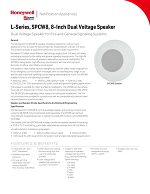 Datasheet for the Gamewell FCI SPCW8, published in 2018. Document No: 9021-60927, Rev: D. Models SPCW8, SB-SPC8 and SP-SPC8. Product features, environmental operating limits, and compatibility data.