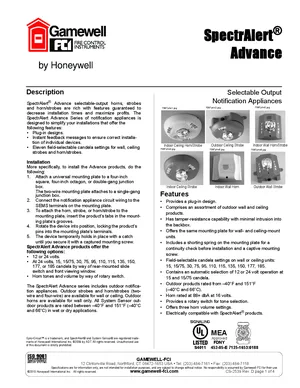 Datasheet for the Gamewell FCI SpectrAlert Advance, published in 2015. Document No: CS-2539, Rev: D. 50 models including P2R, P2RH, P2RK and 47 additional variants. Product features, environmental operating limits, and compatibility data.