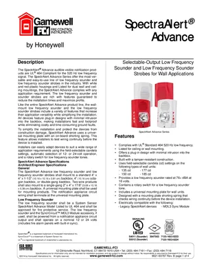 Datasheet for the Gamewell FCI SpectrAlert Advance Low Frequency, published in 2014. Document No: 9021-60787, Rev: B. 4 models including P2RH-LF, P2WH-LF, HR-LF and 1 additional variants. Product features, environmental operating limits, and compatibility data.