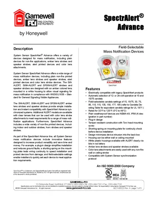 Datasheet for the Gamewell FCI SpectrAlert Advance, published in 2009. Document No: 9021-60520, Rev: A. 36 models including SW-ALERT, SWH-ALERT, SPSW-ALERT and 33 additional variants. Product features, environmental operating limits, and compatibility data.