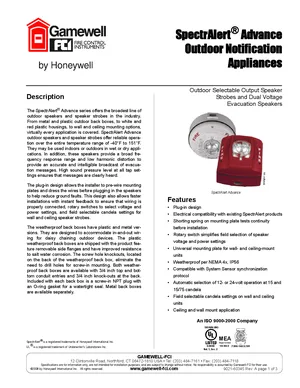 Datasheet for the Gamewell FCI SpectrAlert Advance Outdoor, published in 2008. Document No: 9021-60345, Rev: A. 7 models including SPWK, SPRK, SPSWK and 4 additional variants. Engineering specifications, wiring diagrams, and mounting dimensions.