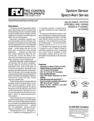 Datasheet for the Gamewell FCI SpectrAlert Selectable Strobes, published in 2003. Document No: 9020-0562, Rev: 1.1. Models P1224MC and S1224MC. Detailed technical specifications, electrical ratings, and agency listings.
