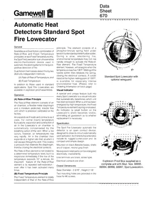 Datasheet for the Gamewell FCI Spot Fire Lowecator, published in 1999. Document No: 670, Rev: 10/99 (revised). 8 models including 47427, 44541, 48095 and 5 additional variants. Detailed technical specifications, electrical ratings, and agency listings.