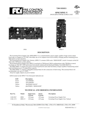 Datasheet for the Gamewell FCI SPSU and SPSU-V. Document No: 9020-0441, Rev: 1.1. Models SPSU and SPSU-V. Detailed technical specifications, electrical ratings, and agency listings.