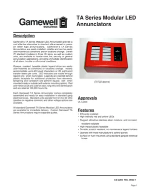 Datasheet for the Gamewell FCI TA Series Modular LED Annunciators, published in 2002. Document No: CS-2285, Rev: 0502-7. 13 models including 70717, 70718, 70720 and 10 additional variants. Engineering specifications, wiring diagrams, and mounting dimensions.