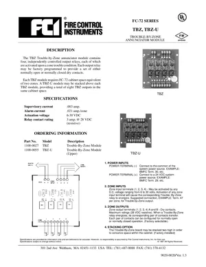 Datasheet for the Gamewell FCI TBZ and TBZ-U, published in 1997. Document No: 9020-0020, Rev: 1.3. Models TBZ, TBZ-U and FC-72. Detailed technical specifications, electrical ratings, and agency listings.
