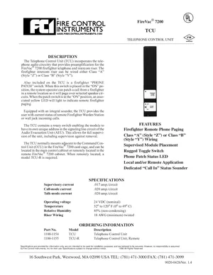 Datasheet for the Gamewell FCI TCU, published in 1998. Document No: 9020-0428, Rev: 1.4. Models TCU and TCU-R. Engineering specifications, wiring diagrams, and mounting dimensions.