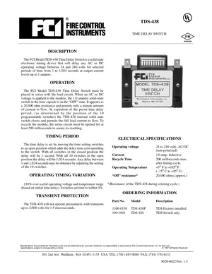 Datasheet for the Gamewell FCI TDS-438, published in 1997. Document No: 9020-0022, Rev: 1.3. Models TDS-438 and TDS-438P. Engineering specifications, wiring diagrams, and mounting dimensions.