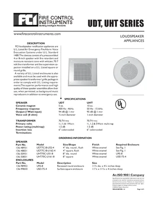 Datasheet for the Gamewell FCI UDT and UHT Series Loudspeakers, published in 2003. Document No: 9020-0308, Rev: 1.4. 8 models including UDT, UHT, UDT7C-B-U52-4 and 5 additional variants. Product features, environmental operating limits, and compatibility data.