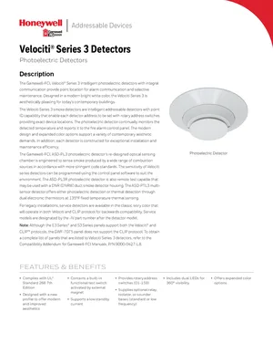 Datasheet for the Gamewell FCI Velociti Series 3 Detectors, published in 2018. Document No: 9020-0617, Rev: K. 9 models including ASD-PL2F, ASD-PTL2F, ASD-PL2FR and 6 additional variants. Detailed technical specifications, electrical ratings, and agency listings.