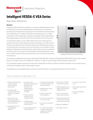 Datasheet for the Gamewell FCI Intelligent VESDA-E VEA Series, published in 2020. Document No: 9021-61037, Rev: A1. Models VEA-040-A00-GW and VEA-040-A10-GW. Product features, environmental operating limits, and compatibility data.