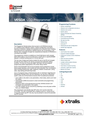 Datasheet for the Gamewell FCI VESDA LCD Programmer. Document No: GF12246, Rev: 08. Models VRT-100, VSP-012 and VHH-100. Engineering specifications, wiring diagrams, and mounting dimensions.